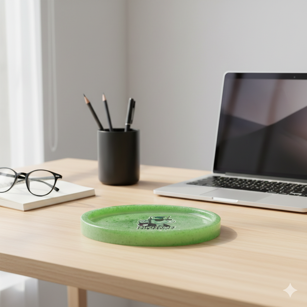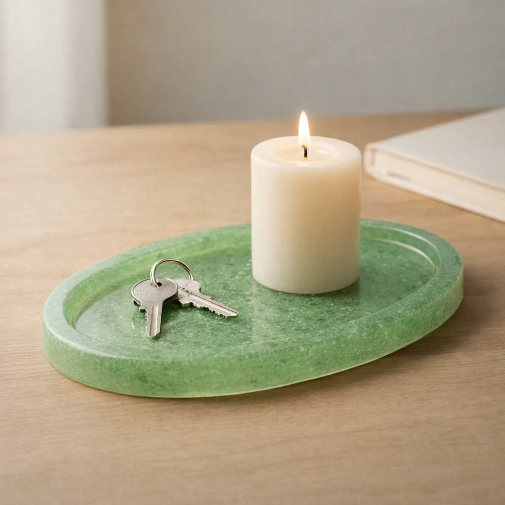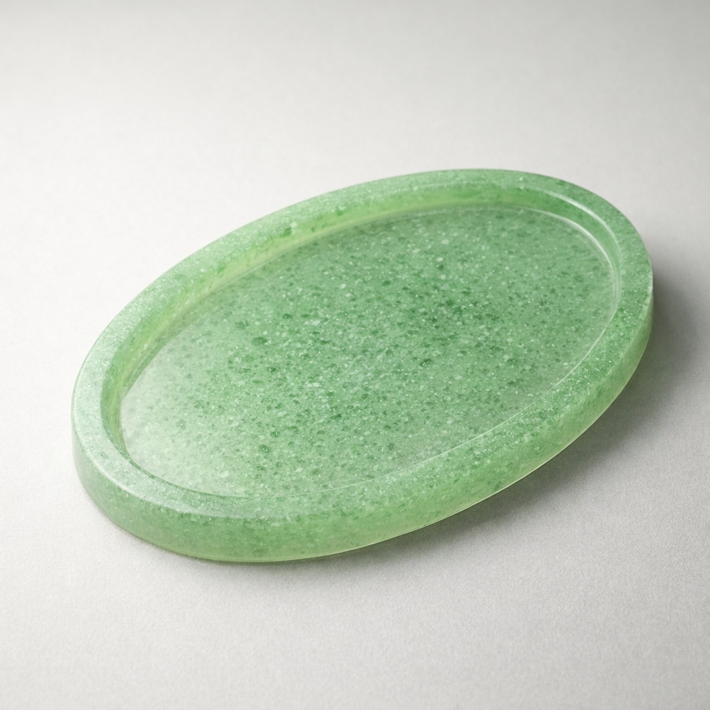 Bandeja Ovalada artesanal elaborada a partir de vidrio pulverizado y resina. Diseñada para sostener huevos o pequeños objetos del hogar. Cada pieza presenta variaciones naturales en color, densidad y textura.